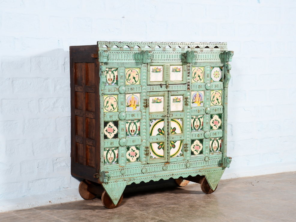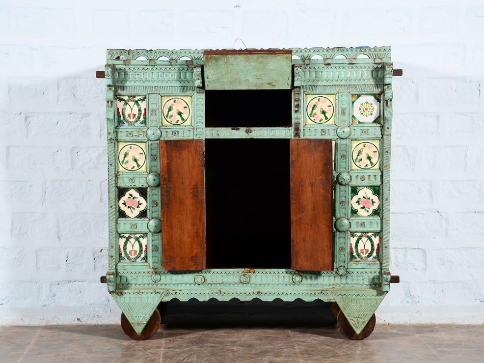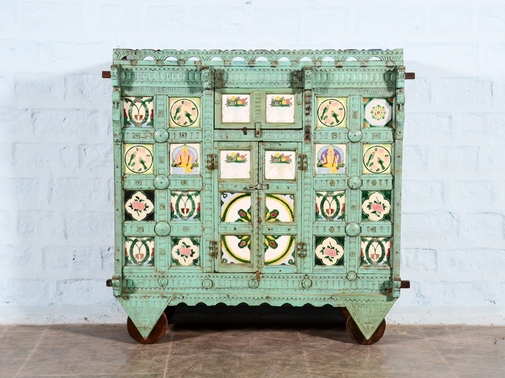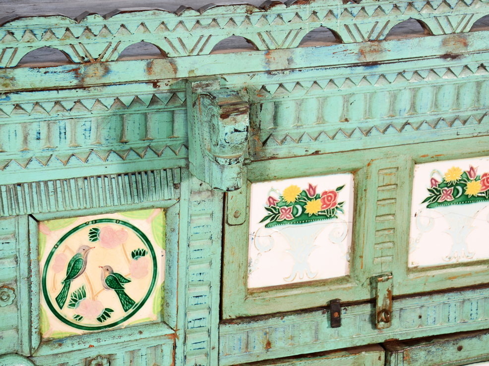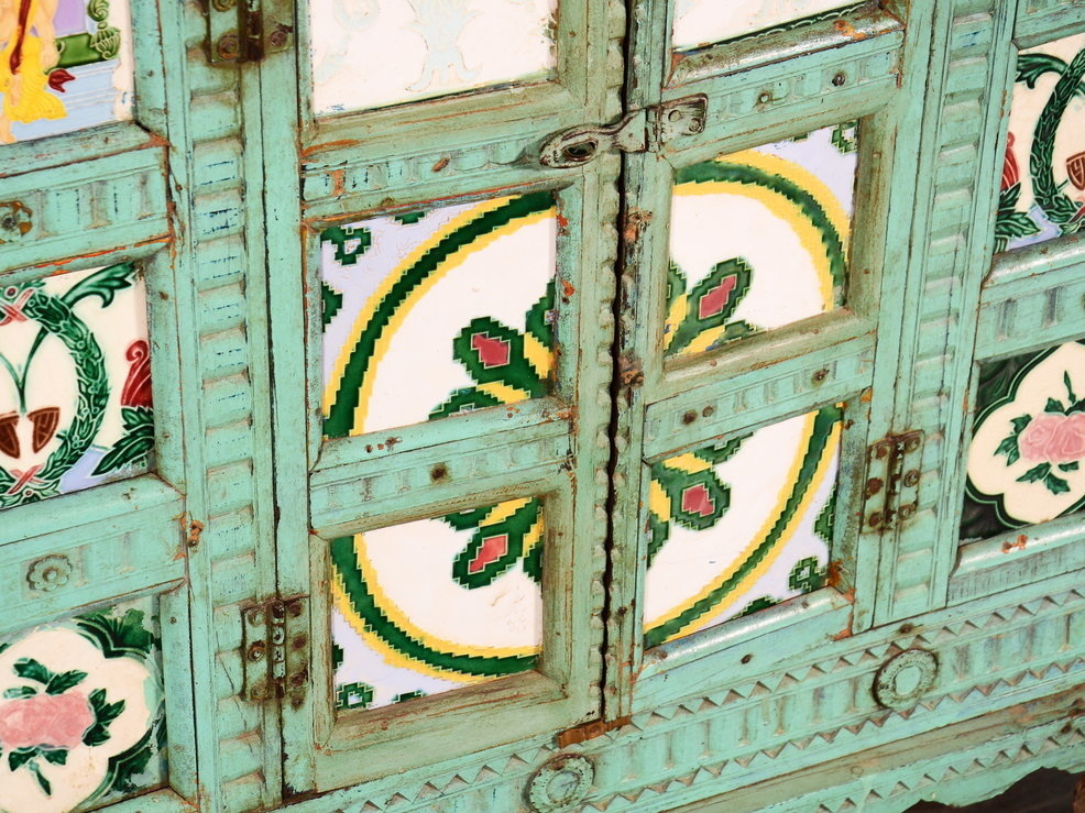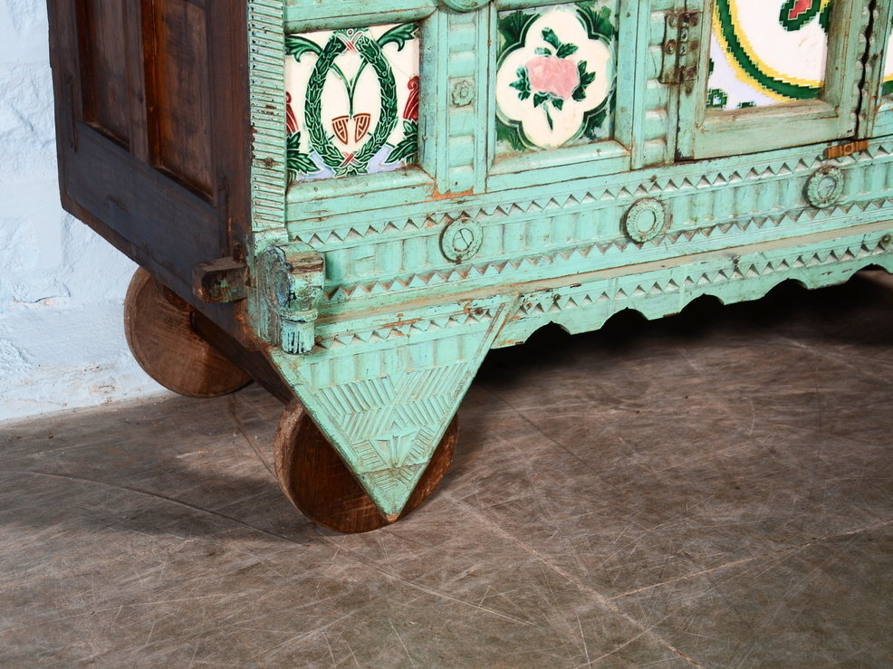 Antieke Indiase Damchiyakist uit Noord West India. Prachtig turquoise en hand geschilderde tegeltjes. Ongeveer 160 jaar oud. 127 x 60 x 133 cm