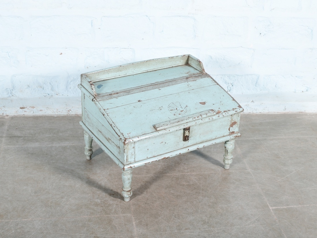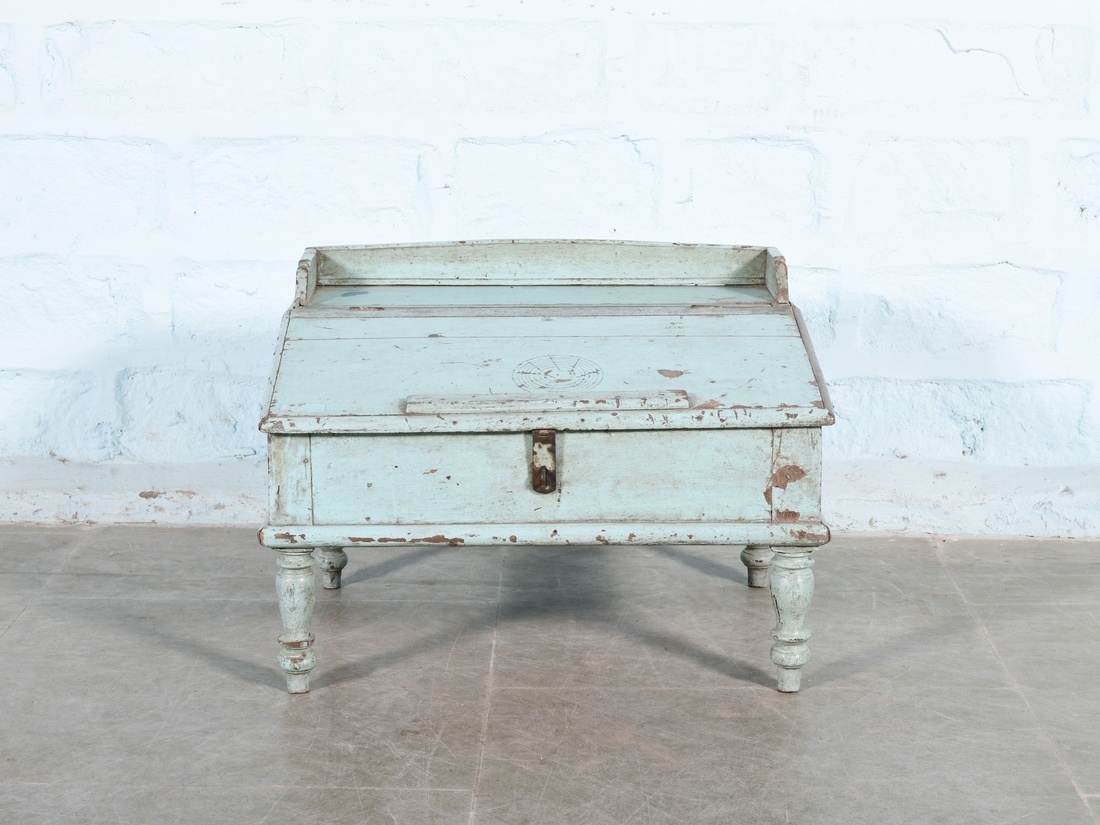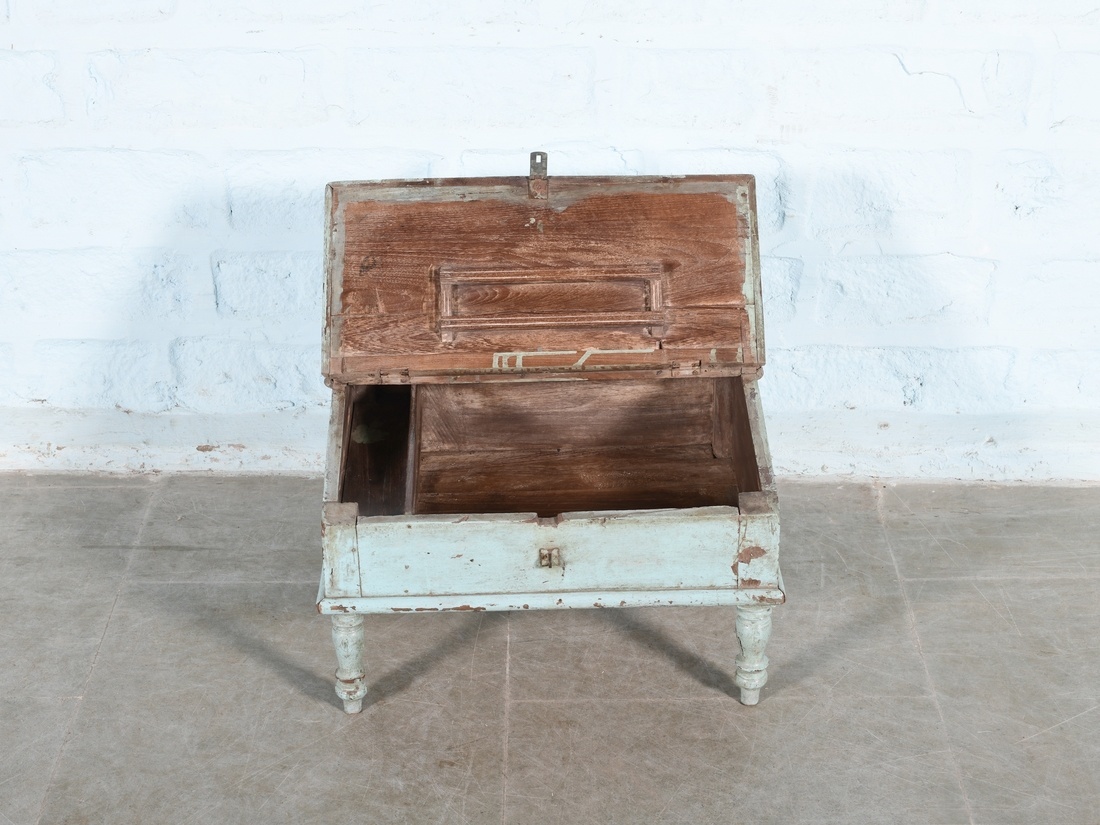 60 x 42 x 44 cmAntieke kist uit India die werd gebruikt als bureautje op scholen.