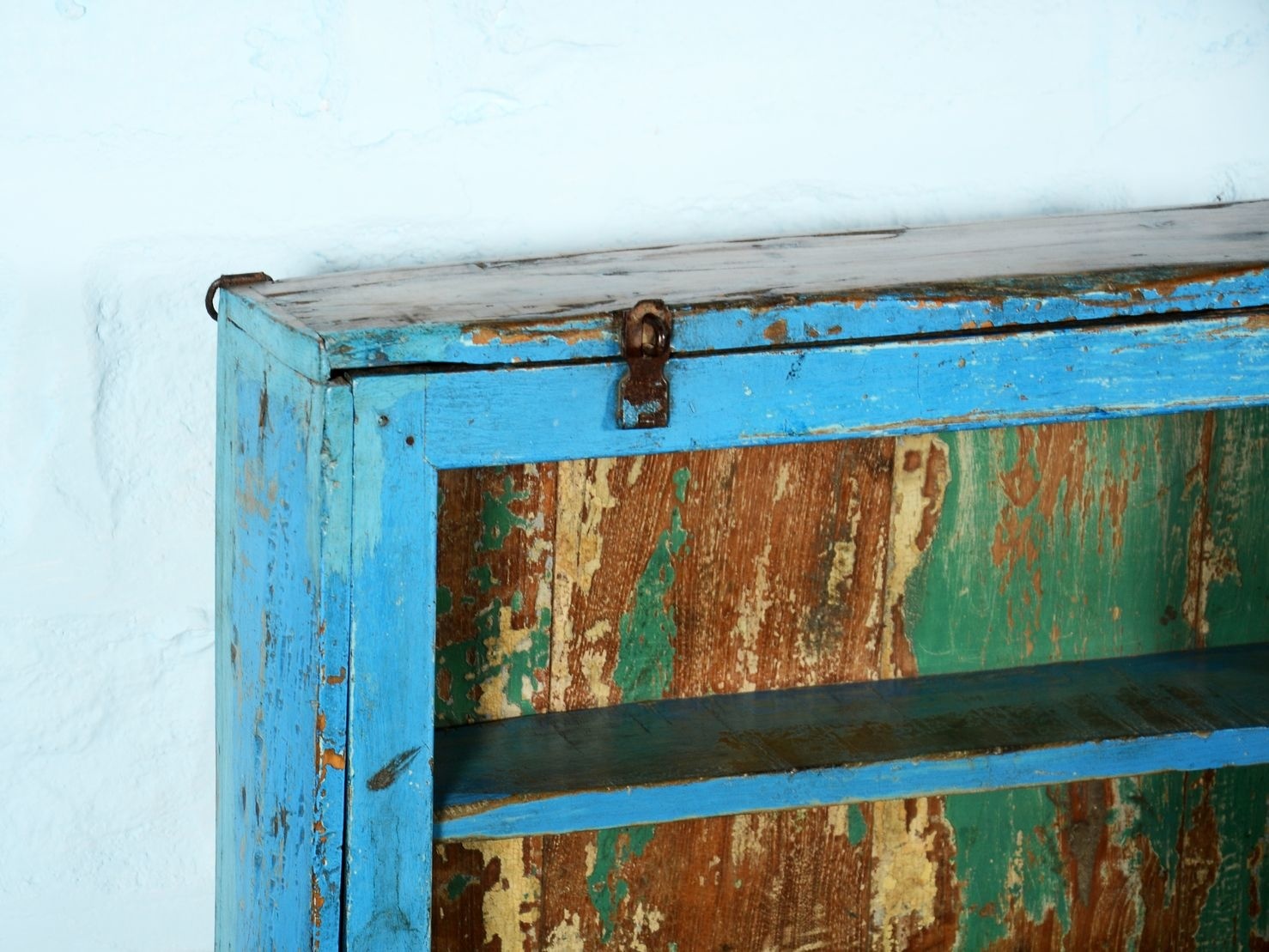 Teakhouten wand vitrinekast afkomstig uit een kruidenierswinkel in Mumbai. 60 x 13 x 123 cm